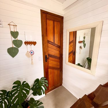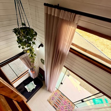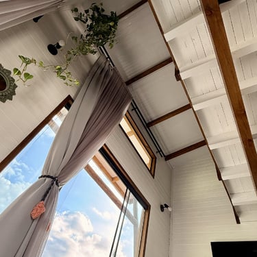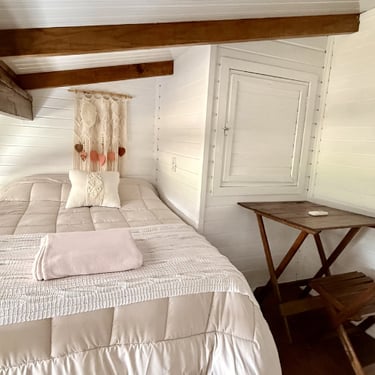 Nossos Bangalôs em estilo Tiny House, possuem um pé direito duplo que proporcionam mais aconchego e iluminação natural garentindo privacidade e relaxamento em uma cama de casal no mesanino.