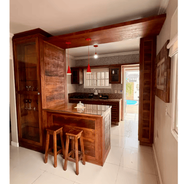 Balcão americano com banquetas cristaleira e taças para vinho.