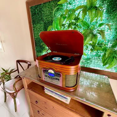 Sala de estar com toca discos e sistema de som.