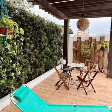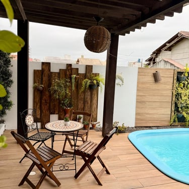 Área externa charmosa, com pergolado coberto por vegetação natural que oferece sombra, clima agradável e acolhedor.
